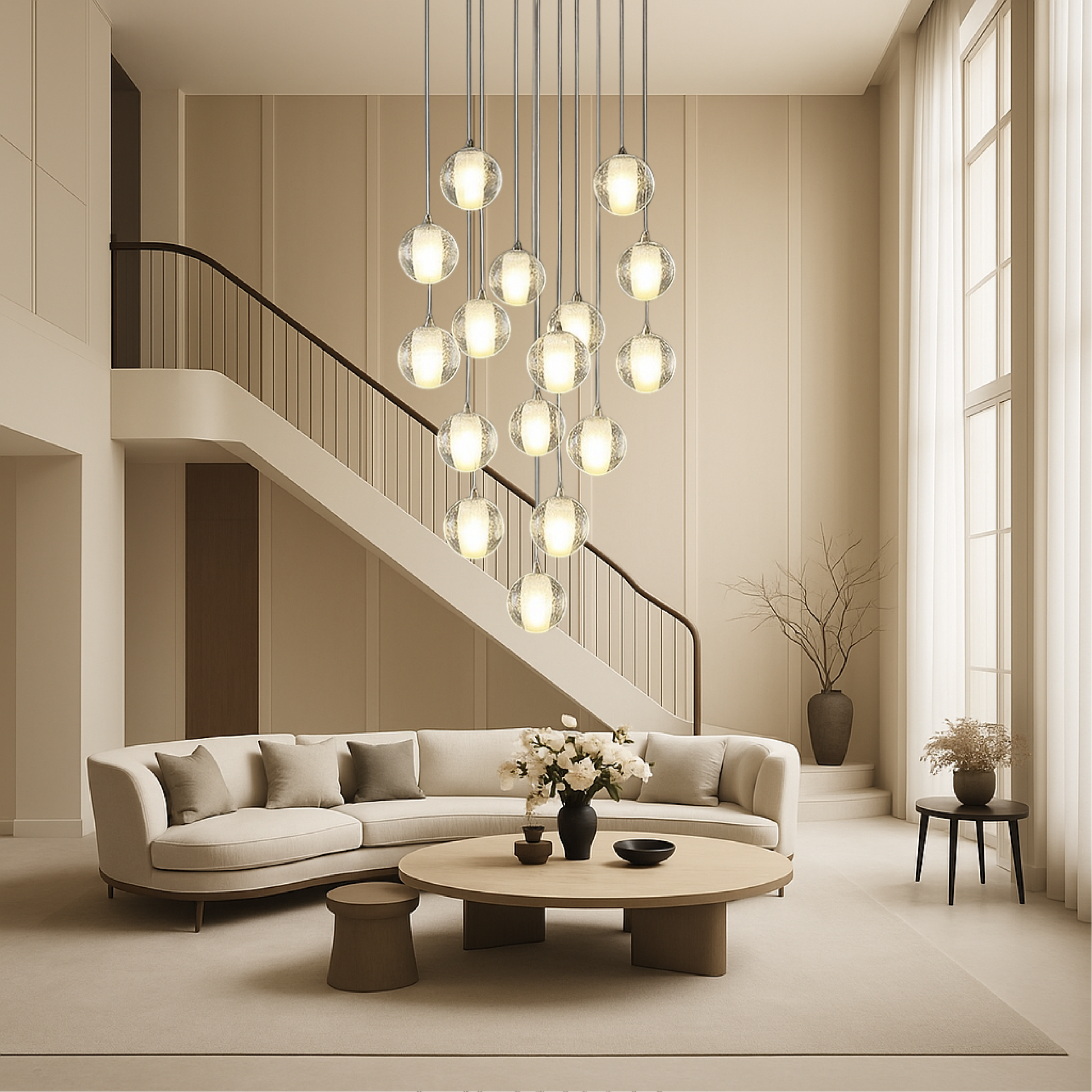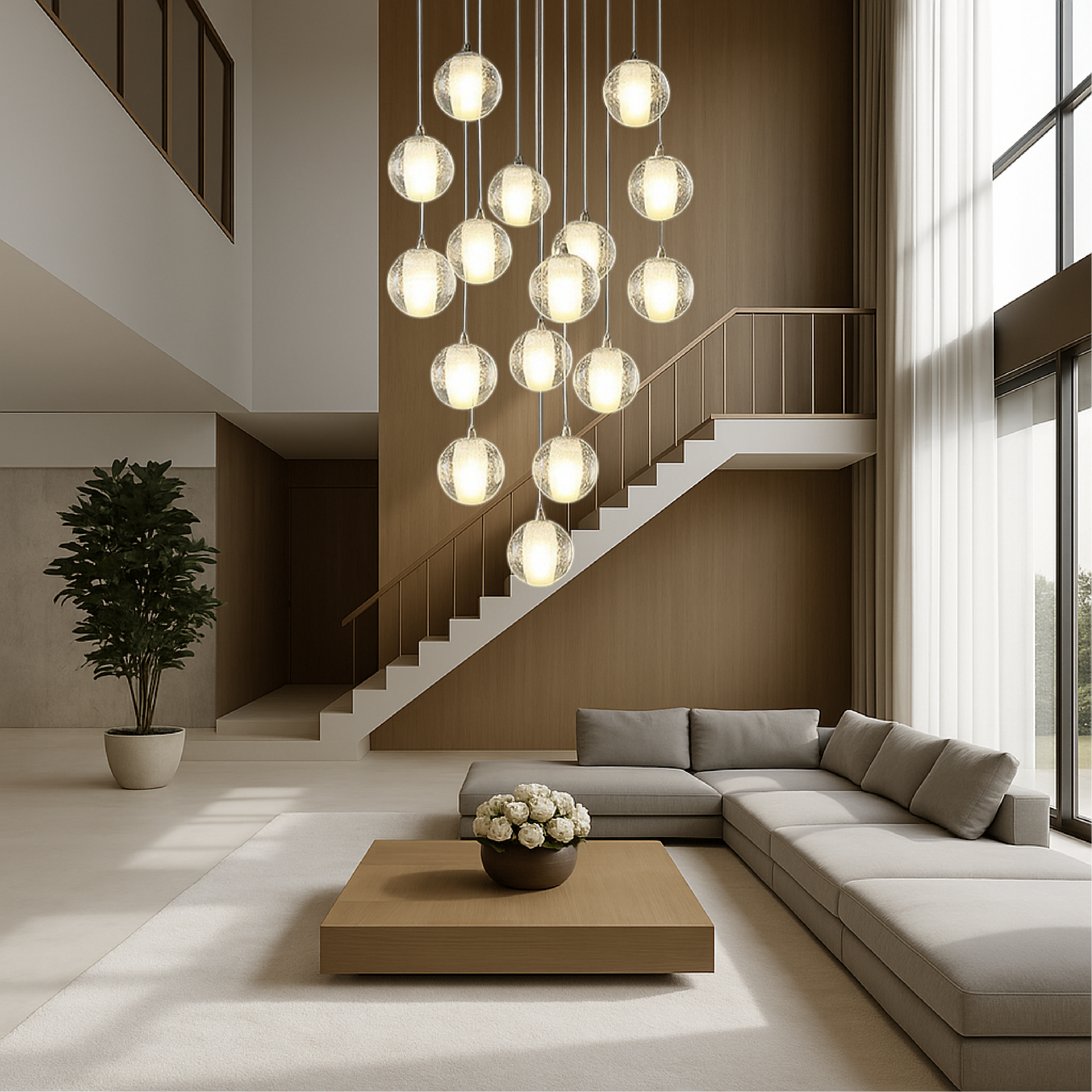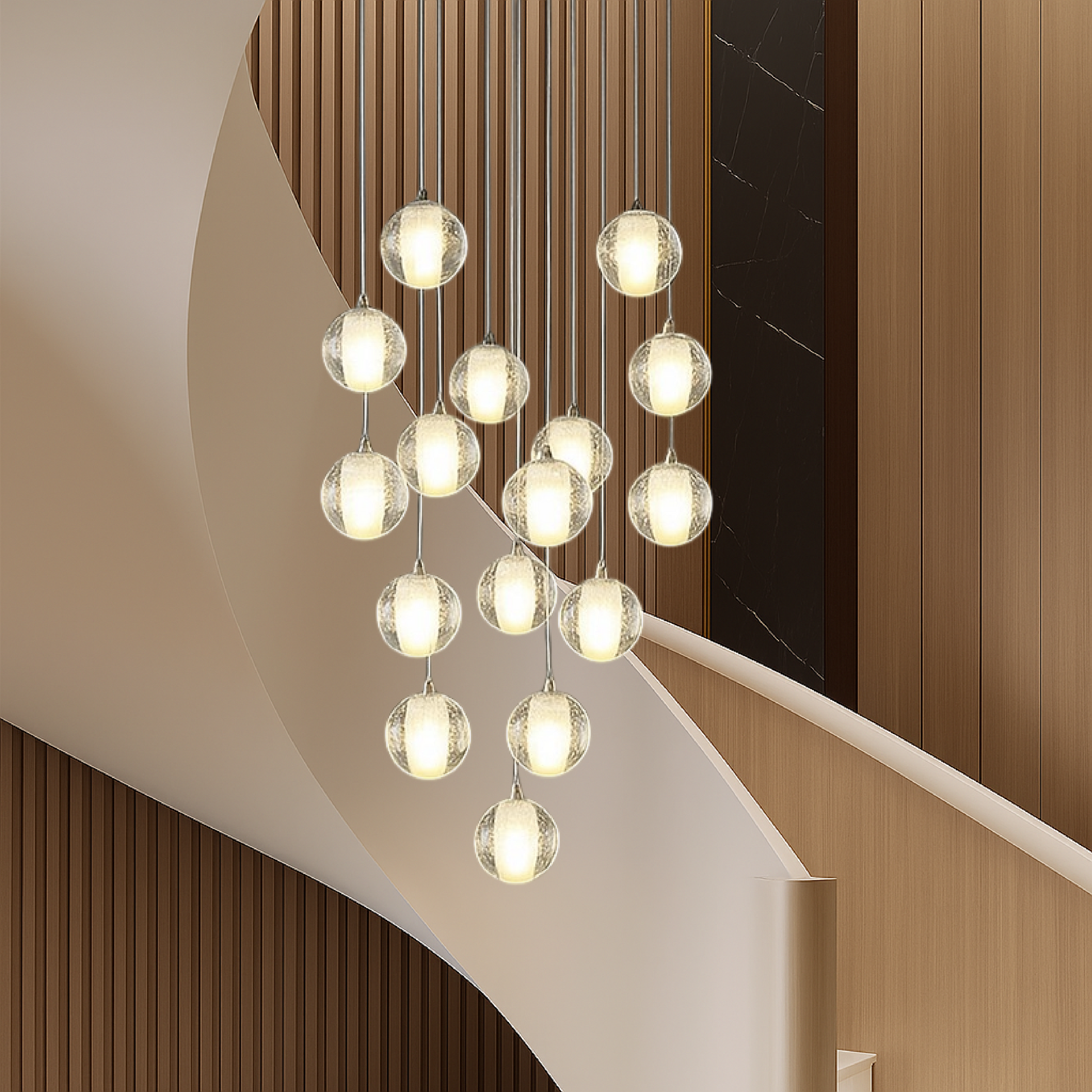 Easy to install and height-adjustable, the Crystal Ball Staircase Chandelier adapts to your space while adding a sophisticated and luminous charm to your home.