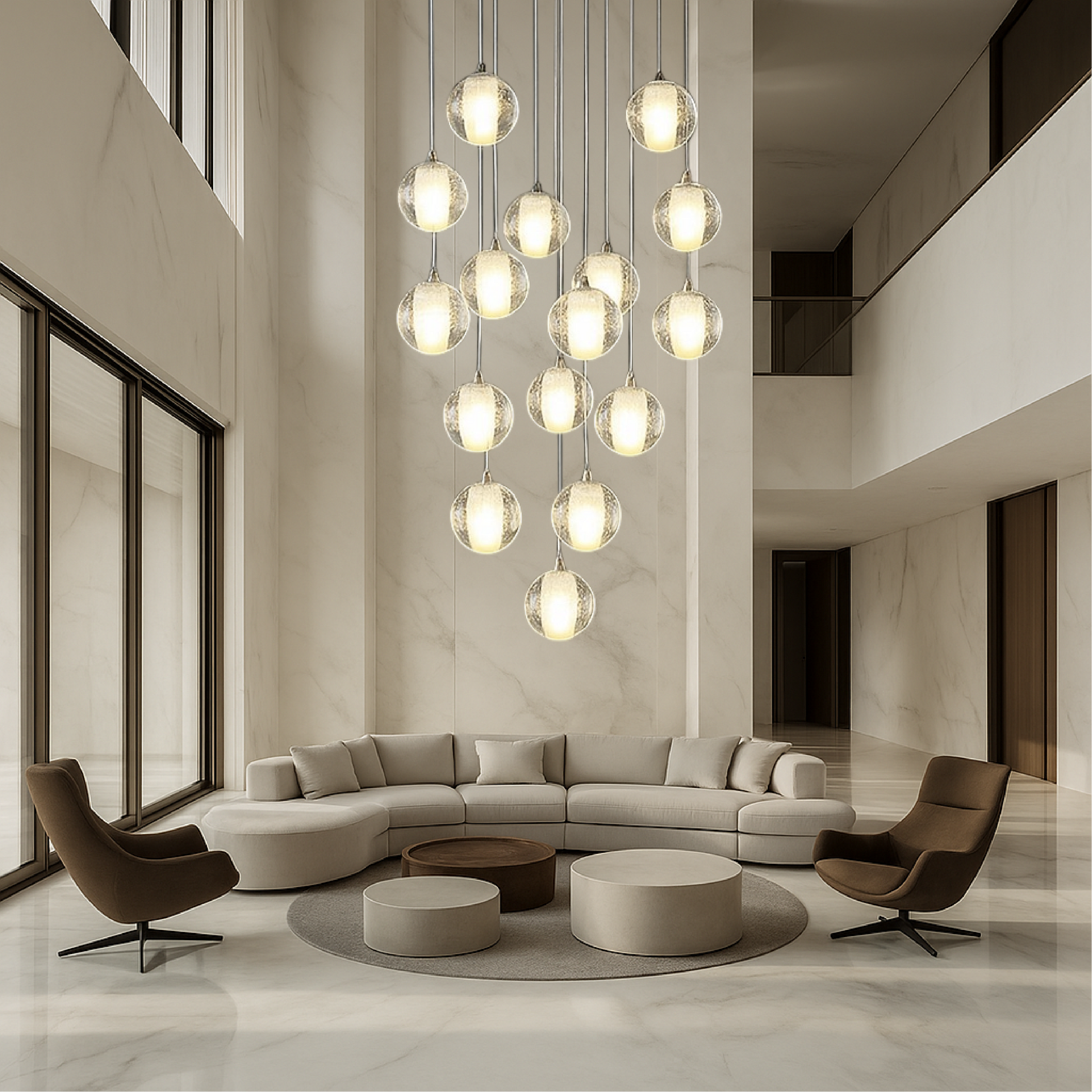 Discover the crystal chandelier | Crystal Ball, perfect for adding a contemporary touch to your staircase, foyer, or grand entryway. Inspired by modern elegance, its cascading crystal spheres create a sense of luxury and timeless refinement.